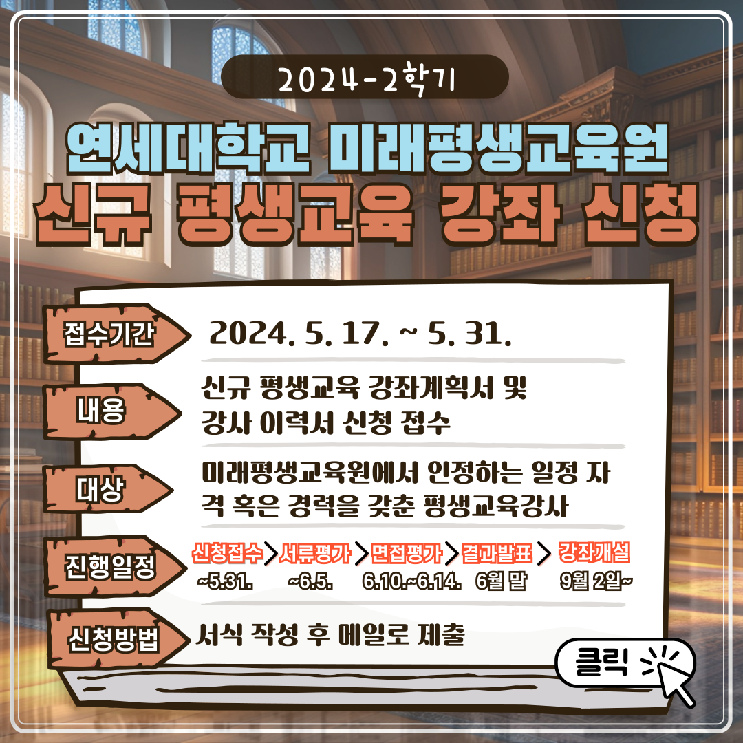 <2024-2학기 미래평생교육원 신규강좌 신청모집> 가. 내용: 신규평생교육강사 및 강좌계획서/신청서 접수 나. 진행기간: 2024.1.5.~1.15. 다. 대상: 미래평생교육원에서 인정하는 일정 자격 혹은 경력을 갖춘 평생교육강사 라. 신청방법: 첨부파일 작성하여 담당자 메일 제출(moolguy@yonsei.ac.kr) 마. 진행일정 ※강사선발 이후 미래평생교육원 전체 교강사 오리엔테이션이 있을 예정