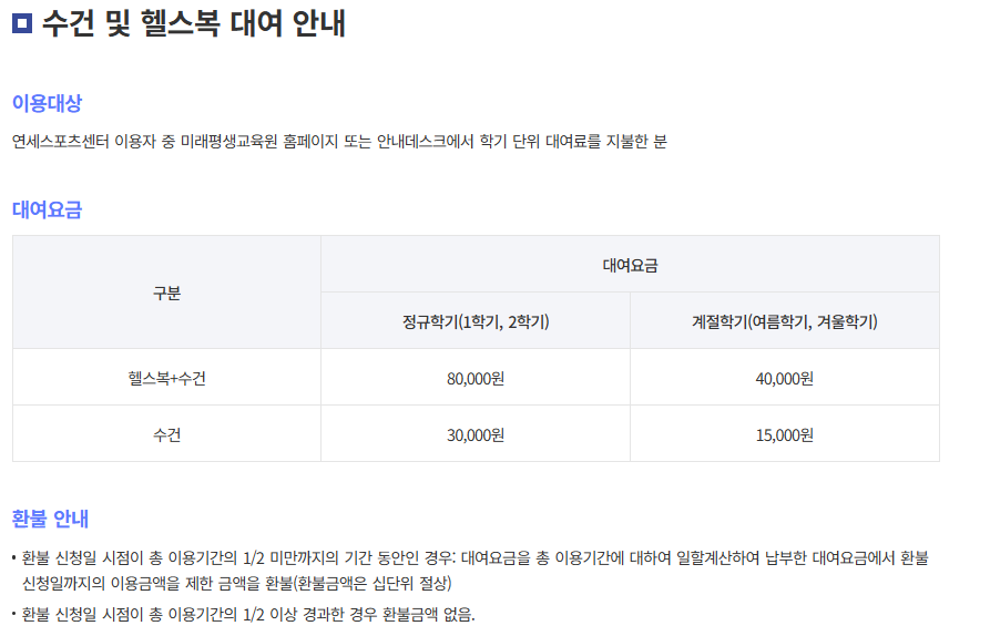 [2026학년도 1학기 연세회원권 등록 안내] 2026학년도 1학기 연세회원권을 다음과 같이 운영하오니 많은 관심 바랍니다. 가. 운영대상: 재학생, 교직원 및 교직원 직계가족 나. 운영시설: 수영장, 헬스장, 스쿼시장 다. 신청(납부)기간 1) 1차: 2026. 2. 9.(월) 10:00 ~ 2026. 2. 13.(금) 23:59까지 2) 2차: 2026. 2. 23.(월) 10:00 ~ 2026. 2. 27.(금) 23:59까지 ※환불 기준은 신청 시 반드시 확인하여 신중히 납부하시기 바랍니다. 라. 운영기간: 2026. 3. 5.(목) ~ 2026. 6. 12.(금) 마. 운영 요일 및 시간: 평일 6:15 ~ 21:50 (공휴일 미운영) 바. 이용요금 1) 연세회원권-교직원 및 가족: 165,000원 2) 연세회원권-재학생: 95,000원 3) 연세회원권-수건+헬스복 대여: 80,000원 4) 연세회원권-수건 대여: 30,000원 ※수건,헬스복 대여 환불 기준은 첨부파일 확인 바랍니다. -바로가기 LINK: https://uni.yonsei.ac.kr/fmcs/40 사. 신청방법 - 평생교육과정<수강신청(교육/강좌 목록)<연세대학교 미래평생교육원<연세회원권