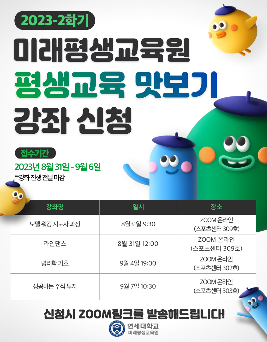 ▲ 클릭 시 신청페이지로 이동 2023-2학기를 맞이하여, 「평생교육 맛보기 강좌」를 운영합니다. 1. 수강신청이 망설여지시는분! 2. 어떤 강사가 진행하는지 궁금하신분! 3. 주요내용을 미리 알아보고 싶으신 분! 맛보기 강좌에 무료로 참여해보시고, 수강신청을 결정하시기 바랍니다. ※ 라인댄스 현장 참여 복장: 편안한 복장+실내용 운동화 신청을 희망하시는 분은 아래 링크(포스터 클릭)로 접속하셔서, 참석여부를 입력하여 주시기 바랍니다. 온라인으로 참여를 희망하시는 경우 입력하신 정보로 온라인 줌링크를 발송하여 드립니다. ▶참여신청 링크: https://forms.gle/y3yqqScR67pphaCa9 ■ 문의: 미래평생교육원 담당자 moolguy@yonsei.ac.kr. / 033-760-2703 |