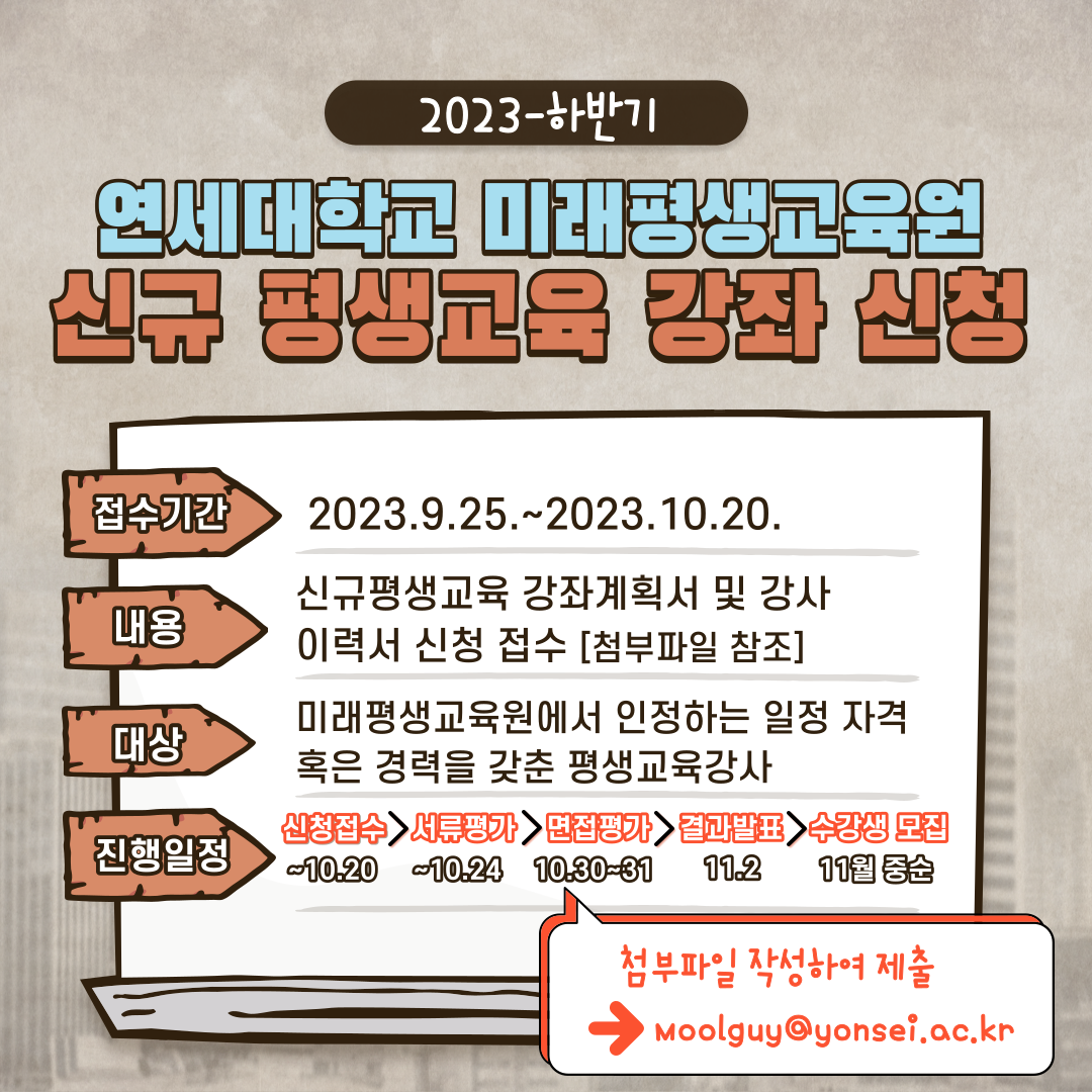 <2023-겨울학기 미래평생교육원 신규강좌 신청모집> 가. 내용: 신규평생교육강사 및 강좌계획서/신청서 접수 나. 진행기간: 2023.9.25.~10.20. 다. 대상: 미래평생교육원에서 인정하는 일정 자격 혹은 경력을 갖춘 평생교육강사 라. 신청방법: 첨부파일 작성하여 담당자 메일 제출(moolguy@yonsei.ac.kr) 마. 진행일정